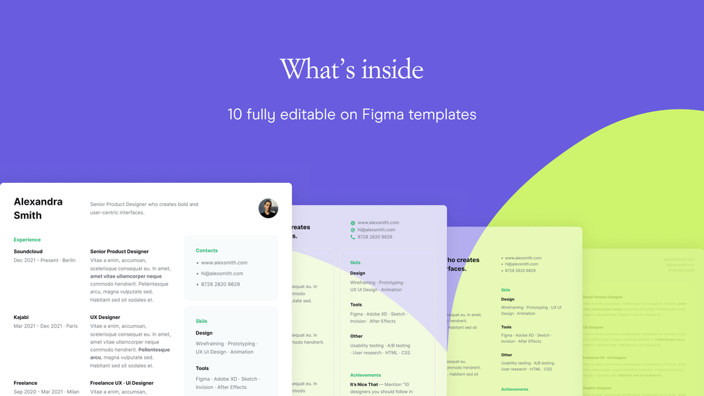 ✦ 10 fully editable templates designed on Figma that can be exported to PDF file.